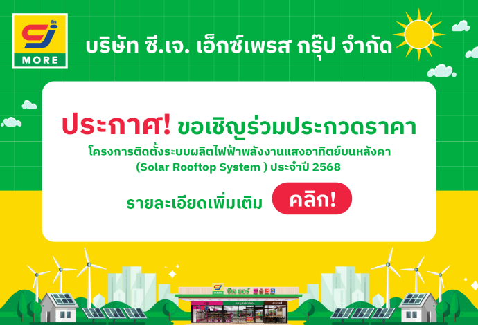 โครงการติดตั้งระบบผลิตไฟฟ้าพลังงานแสงอาทิตย์บนหลังคา (Solar Rooftop System ) และจำหน่ายไฟฟ้า ให้กับบริษัท ซี.เจ. เอ็กซ์เพรส กรุ๊ป จำกัด ประจำปี 2568 13 ธันวาคม 2567