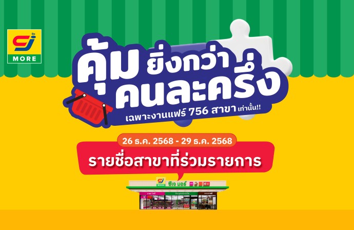 ซีเจ มอร์ ชวนช้อปส่งท้ายปีในงานแฟร์สุดคุ้ม “คุ้มยิ่งกว่าคนละครึ่ง” ยกขบวนสินค้าของกิน ของใช้ และสินค้าจำเป็นในชีวิตประจำวันมาให้เลือกช้อปในราคาพิเศษแบบจัดเต็ม เฉพาะในงานแฟร์เท่านั้น เพื่อให้ทุกคนได้ช้อปแบบครบ ถูก คุ้ม ใกล้บ้าน พร้อมตอกย้ำบทบาทของซีเจ มอร์ ในฐานะซูเปอร์มาร์เก็ตเพื่อชุมชน จัดพร้อมกันถึง 756 สาขาทั่วประเทศ ระหว่างวันที่ 26–29 ธันวาคม 2568 ใครกำลังมองหาสินค้าราคาสบายกระเป๋าช่วงปลายปี ไม่ควรพลาด รีบมาช้อปกันด่วน! ที่ซีเจ มอร์ สาขาที่ร่วมรายการ