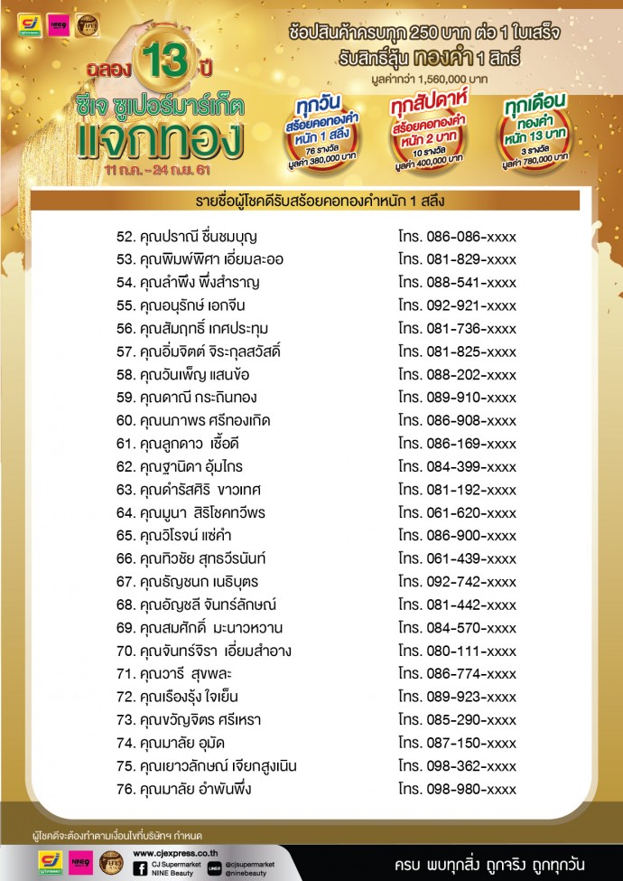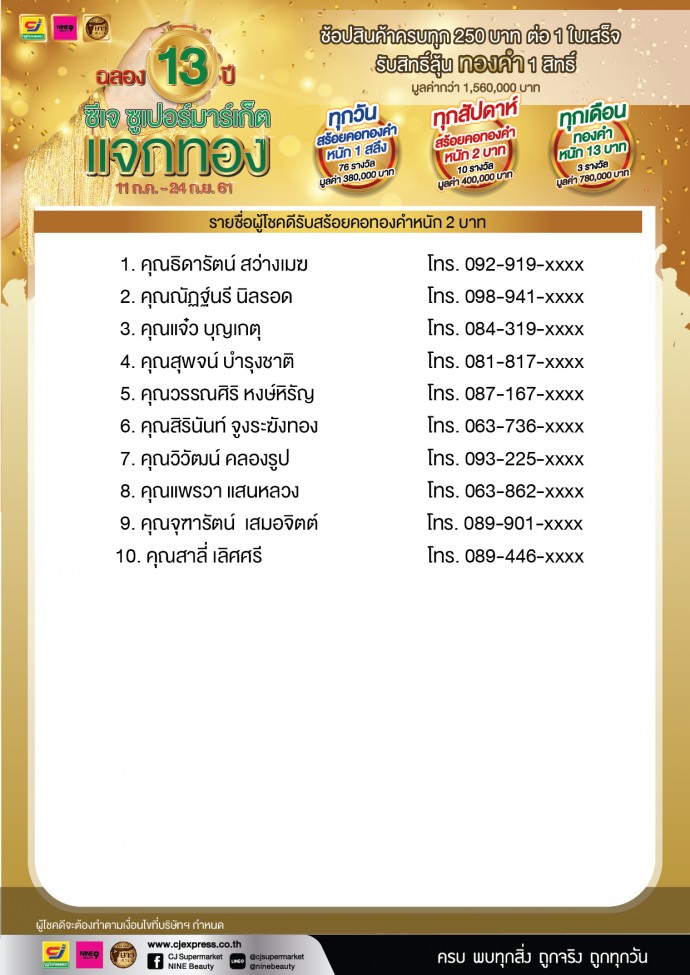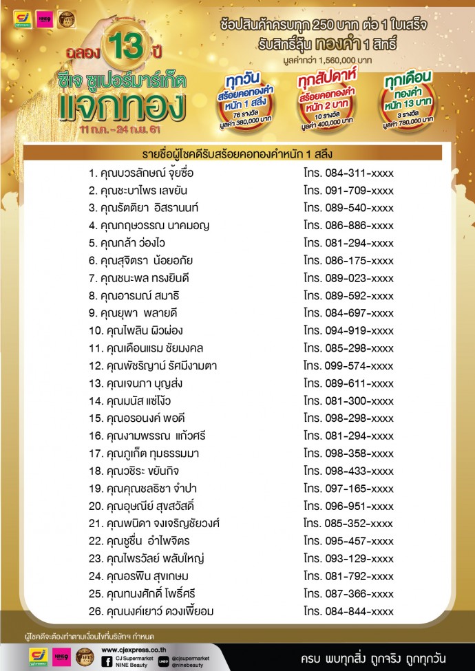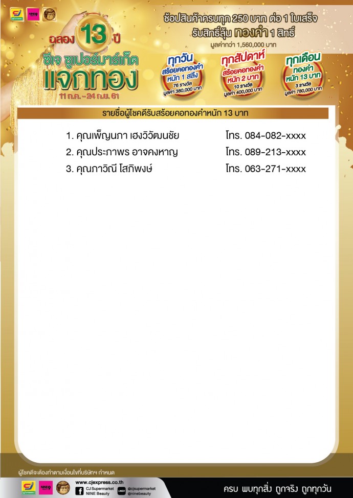 รายชื่อผู้โชคดี ที่ได้รับรางวัลจากกิจกรรม"ฉลอง 13 ปี ซีเจ ซูเปอร์มาร์เก็ต แจกทอง" มูลค่ากว่า 1,560,000 บาท 18 ตุลาคม 2561