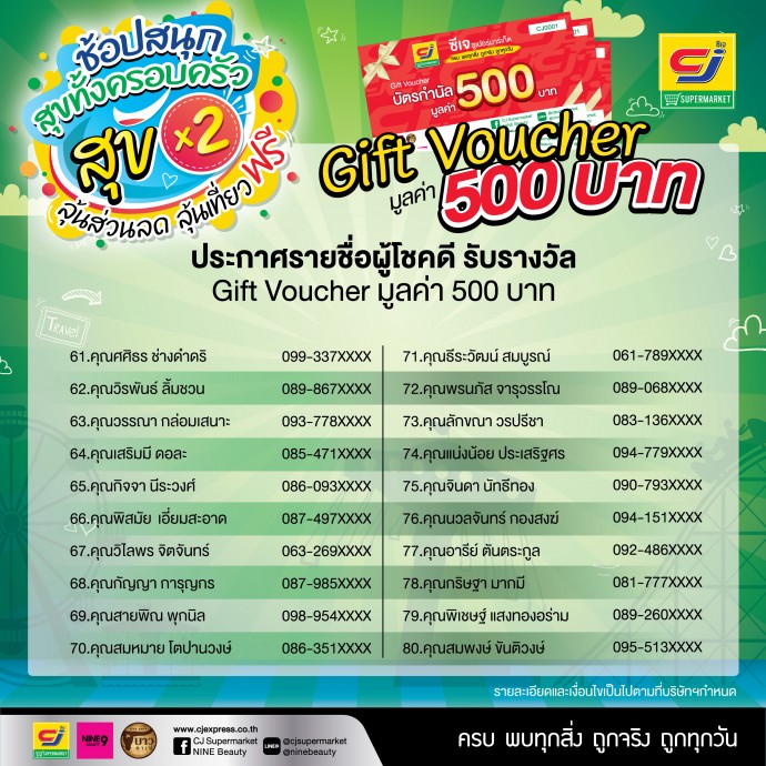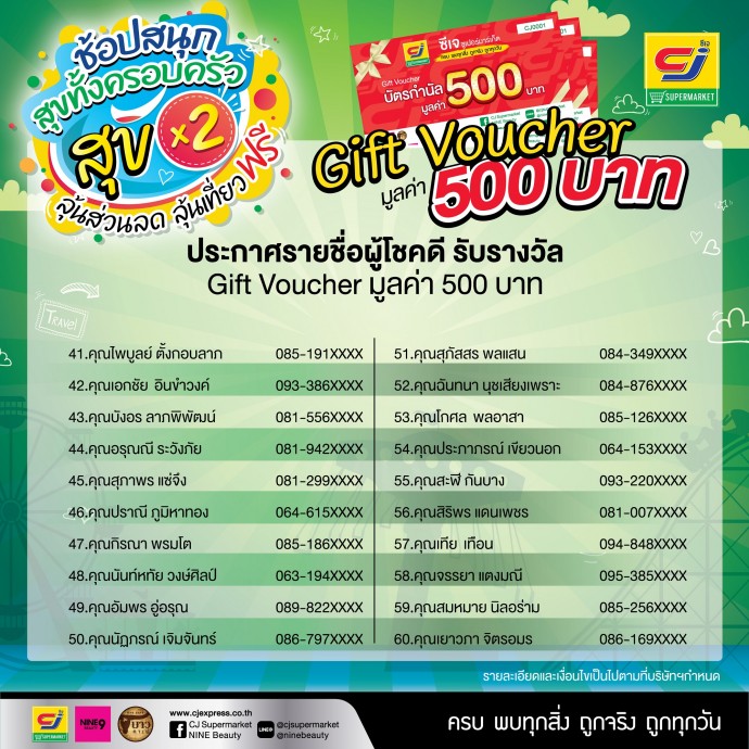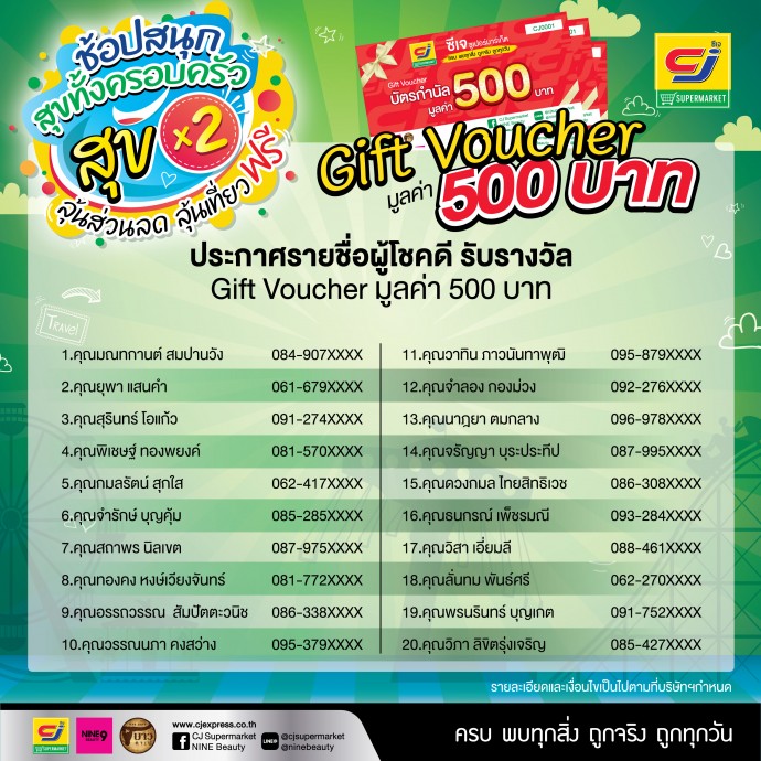 และรายชื่อผู้โชคดี 100 ท่าน ที่ได้รับ Gift Voucher มูลค่า 500 บาท ช้อปสนุก แถมลุ้นกิจกรรมดีๆ แบบนี้ มีที่ CJ Supermarket ค่ะ **ทุกท่านได้รับการติดต่อจากจนท.เรียบร้อยแล้ว เพียงแค่รอรับรางวัลตามที่อยู่ที่แจ้งได้ได้เลยนะคะ