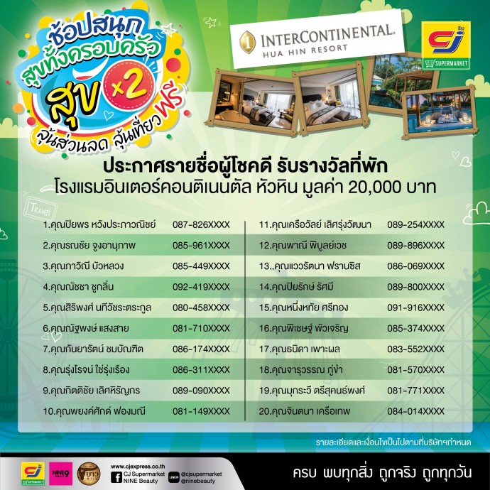 รายชื่อผู้ที่จะได้ไปมีความสุขกับการเที่ยวฟรีพักฟรีกับ CJ Supermarket ที่หัวหิน เป็นเวลา 2 วัน 1 คืน แอดขอแสดงความยินดีอีกครั้งนะคะ และทั้ง 20 ท่านนี้ได้มีจนท.ติดต่อประสานงานเรียบร้อยแล้วค่ะ แล้ววันที่ 23-24 ก.พ. 2562 นี้ เราเจอกันค่ะ