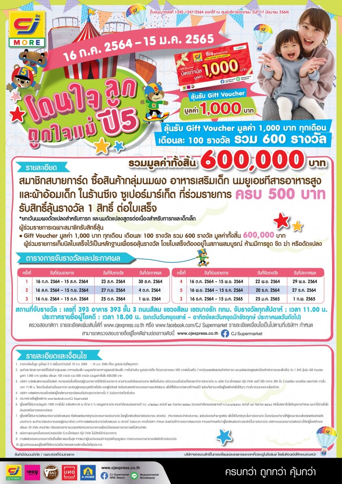 1. รายการโดนใจลูก ถูกใจแม่ ปี 5 จัดขึ้นระหว่างวันที่ 16 ก.ค. 2564 – 15 ม.ค. 2565 ที่ซีเจ ซูเปอร์มาร์เก็ตทุกสาขา