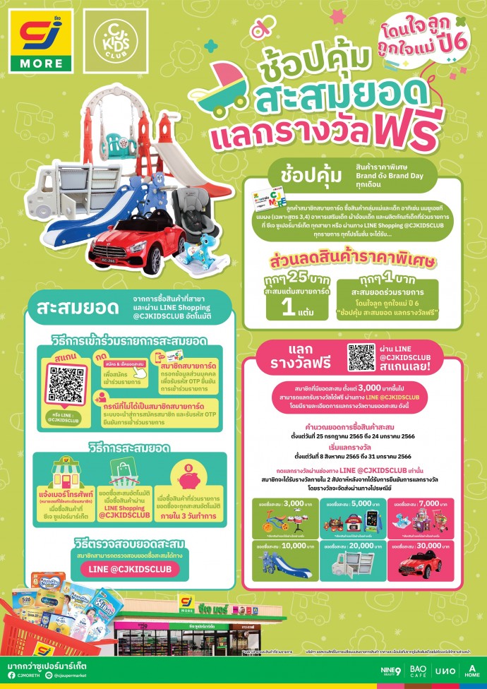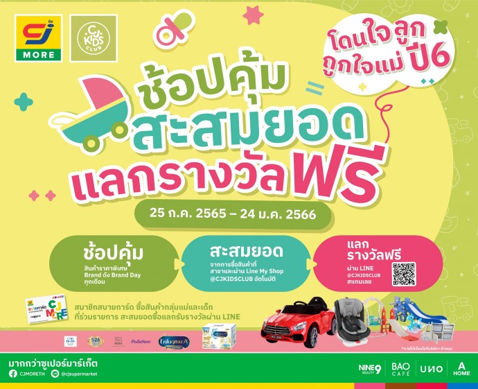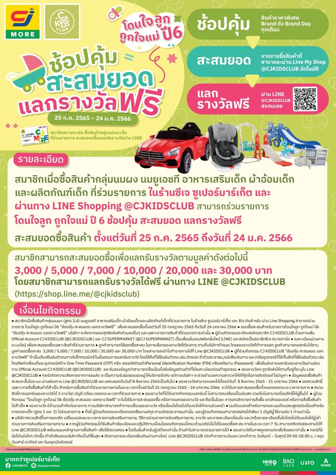 · สมาชิกเมื่อซื้อสินค้ากลุ่มนมผง(สูตร 3, 4)นมยูเอชที อาหารเสริมเด็ก ผ้าอ้อมเด็กและผลิตภัณฑ์เด็กที่ร่วมรายการในร้าน “ซีเจ ซูเปอร์มาร์เก็ต” และ “ซีเจ คิดส์ คลับ” ผ่าน LineShopping สามารถร่วมรายการ โดนใจลูก ถูกใจแม่ ปี6 “ช้อปคุ้ม สะสมยอด แลกรางวัลฟรี”เพื่อสะสมยอดซื้อตั้งแต่วันที่ 25 กรกฎาคม 2565 ถึงวันที่ 24 มกราคม 2566