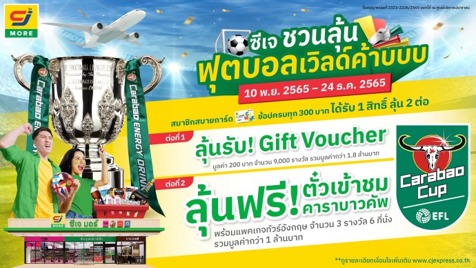 1. รายการ “ซีเจ ชวนลุ้น ฟุตบอลเวิลด์ค้าบบบ” นี้จัดขึ้นระหว่างวันที่ 10 พ.ย.2565 - 24 ธ.ค.2565ที่ซีเจ ซูเปอร์มาร์เก็ตทุกสาขา