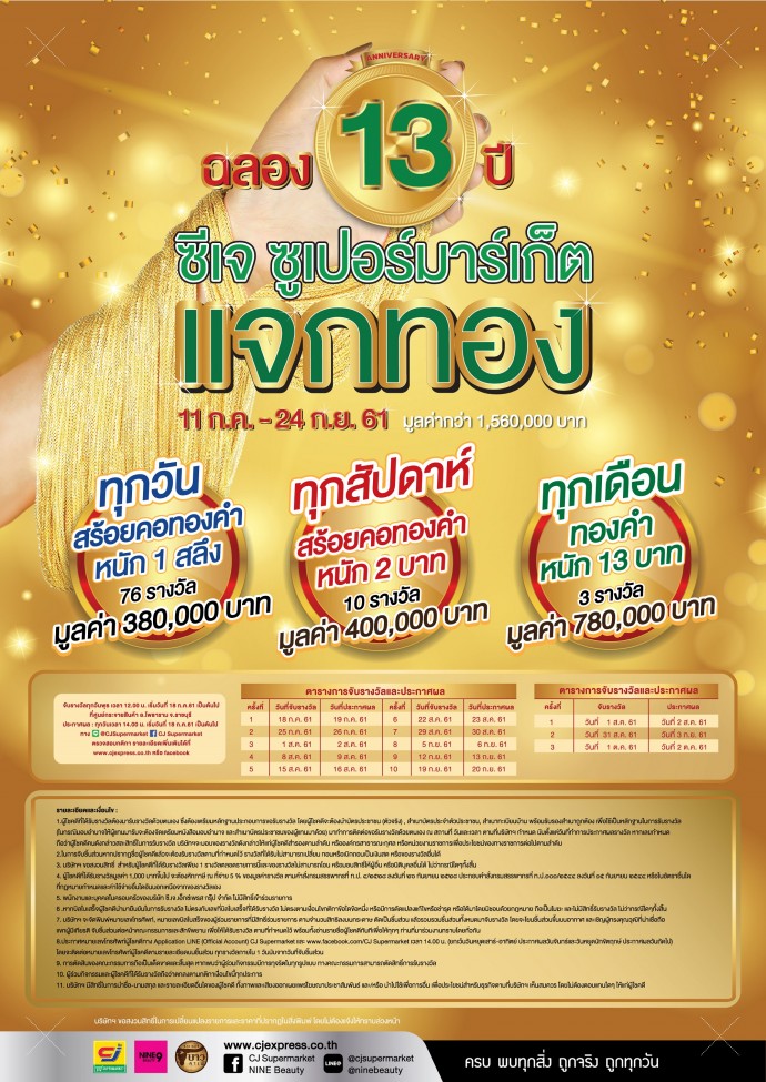 ฉลอง 13 ปี ซีเจ ซูเปอร์มาร์เก็ต แจกทอง มูลค่ากว่า 1,560,000 บาท 10 กรกฎาคม 2561